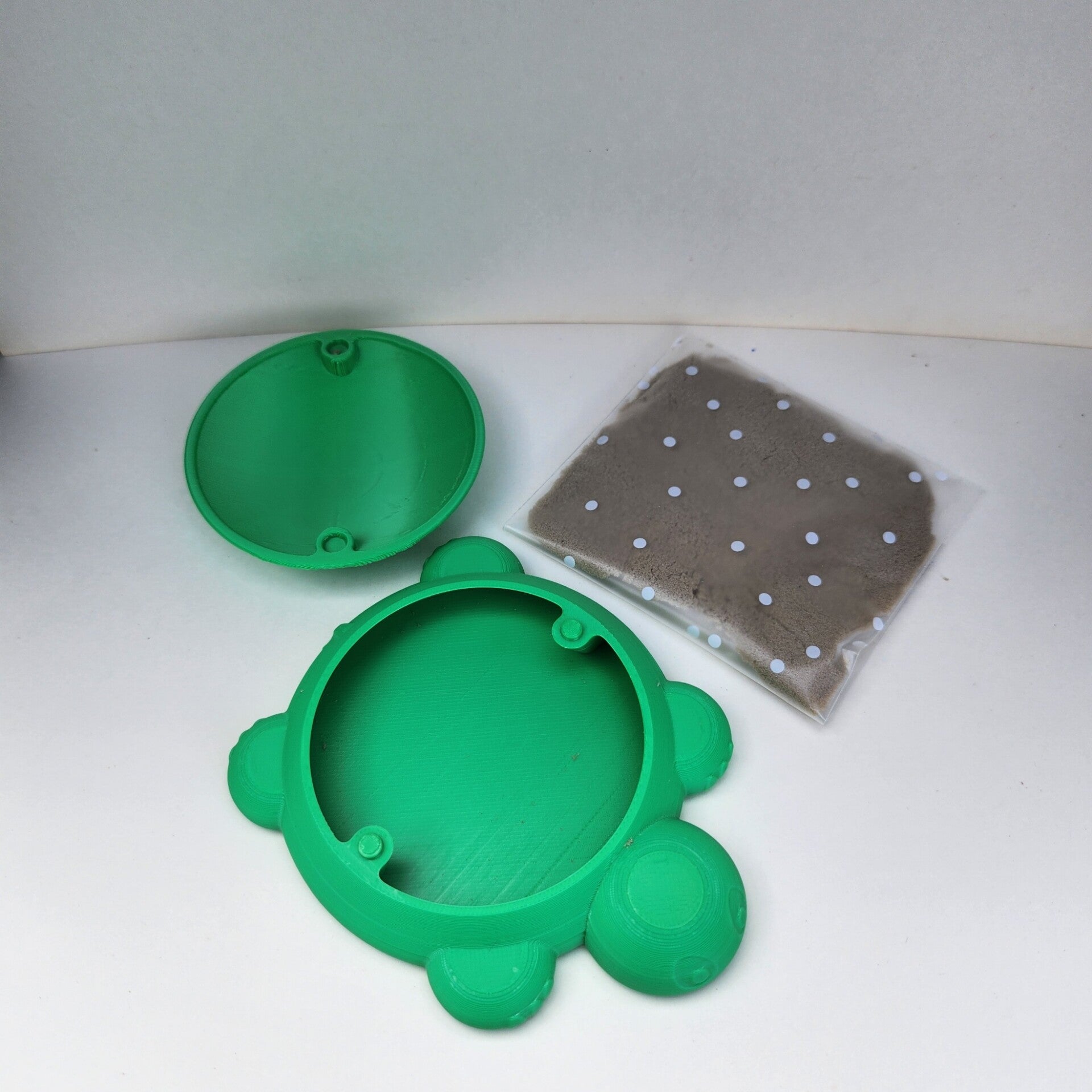 Details: afneembaar schildpaddeksel, gevuld met fijn kinetisch zand